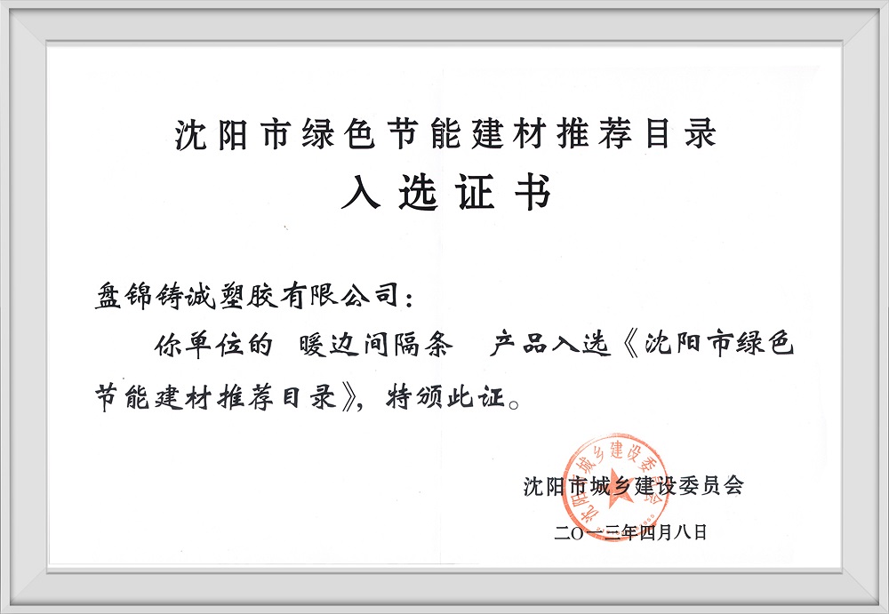 沈阳市绿色节能建材推荐目录入选证书