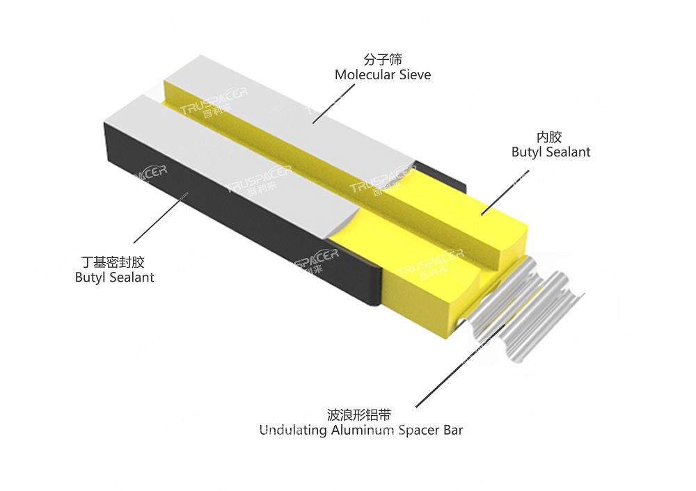 该产品由丁基密封胶、分子筛、内胶(骨架胶)三大功能区构成,并有波浪形铝带作支撑,产品结构设计独特而实用,生产操作简单,质量易于控制。
